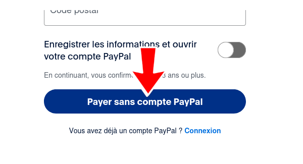 Sur la page PayPal, cliquez sur le bouton « Payer avec une carte de débit ou de crédit ».