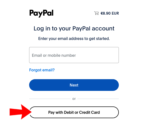 On the PayPal page, click the 'Pay with debit or credit card' button.