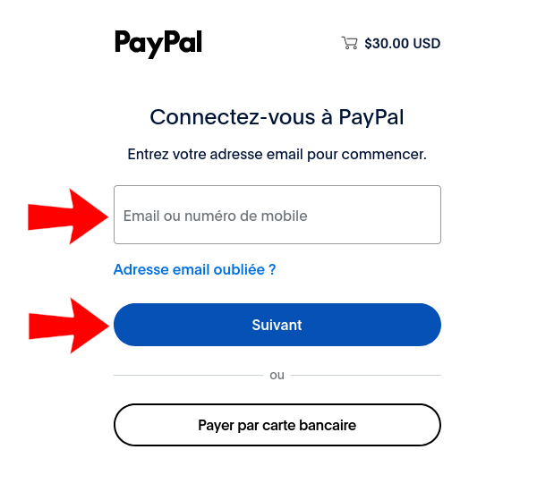 La page suivante vous demandera votre adresse e-mail. PayPal enverra votre reçu à cette adresse e-mail.